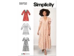 Simplicity Pattern S9702 Misses’ Dress- Size Y5 (18-20-22-24-26) – is a standard printed tissue pattern (not downloadable). V-neck empire-line dress with pockets. Mid-knee to mid-calf lengths. View A: crochet trim V-neckline, long sleeves gathered to self bias binding edges. View B: ruffled hem, long sleeves elasticated at wrist with ruffles. View C: tiered skirt, short ruffled sleeves gathered at sleee cap. Designed for woven fabrics. Sew Rating: Average. See the second image for back of the pattern packet which lists recommended fabric types, size chart and meterage required.
