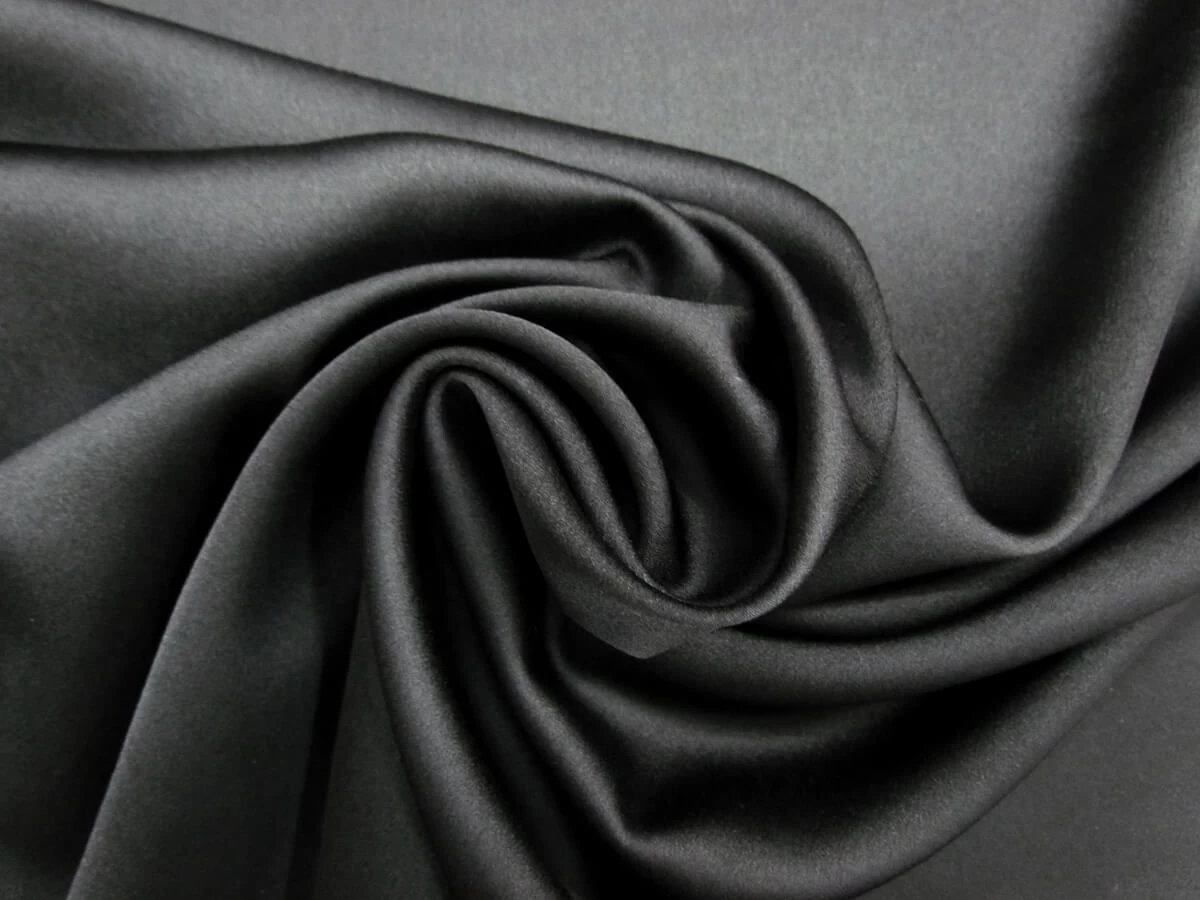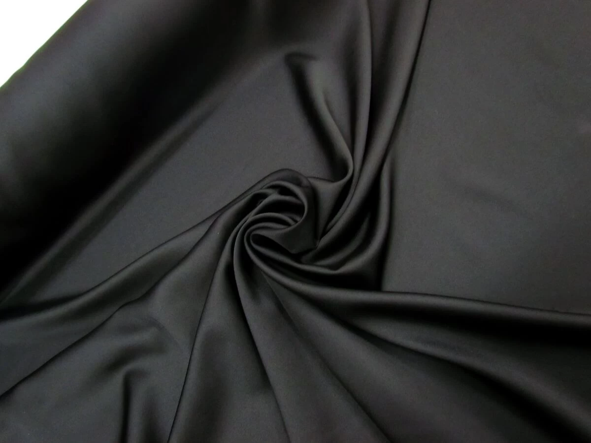 This satin crepe in black has a slightly lustrous sheen and is a soft fabric with slight texture from the crepe weave, with the reverse side having a matte and more textured feel. This soft satin crepe is a light weight fabric with a slight stretch along the weft of the fabric. This satin crepe is a fully opaque fabric.