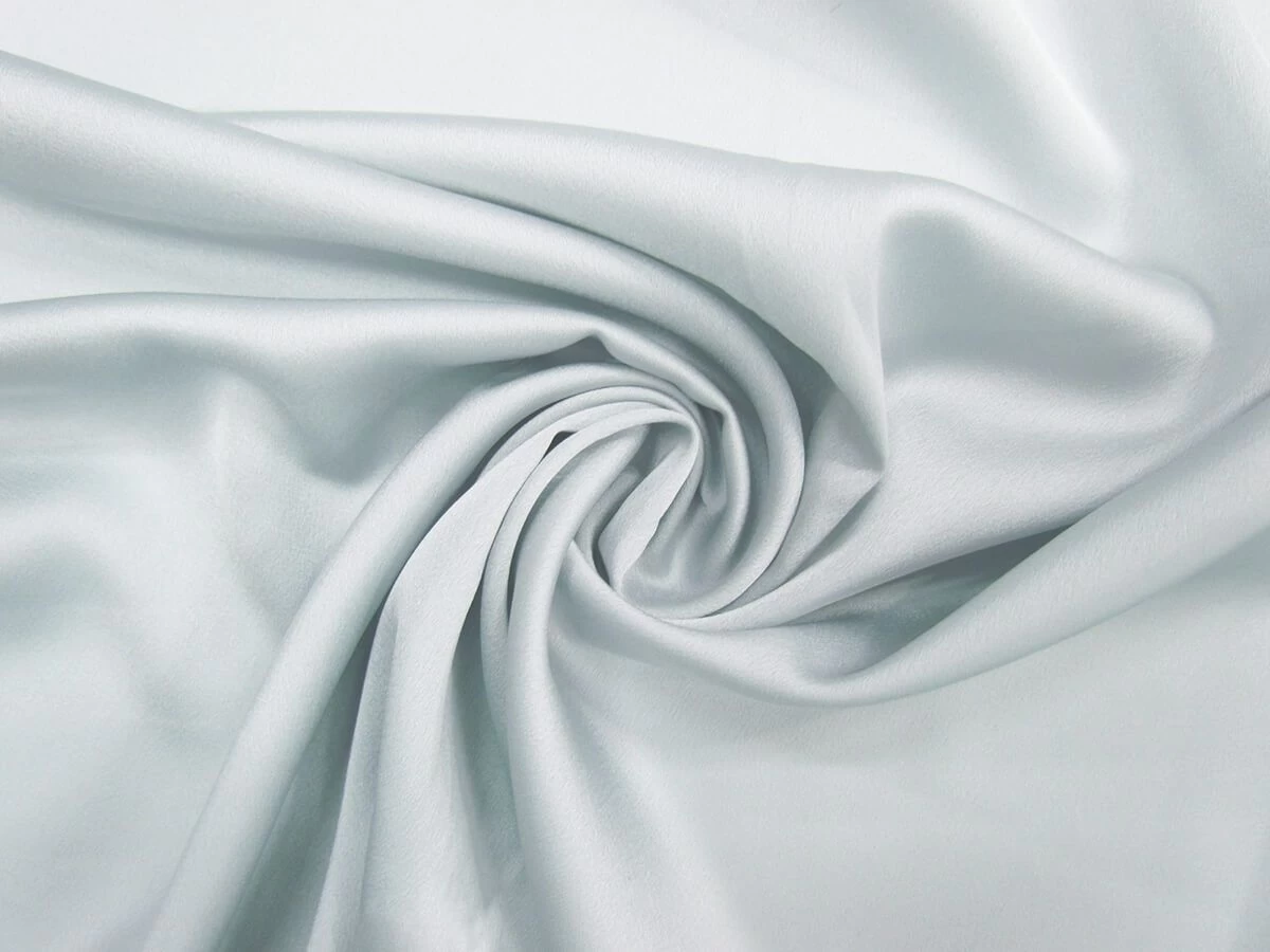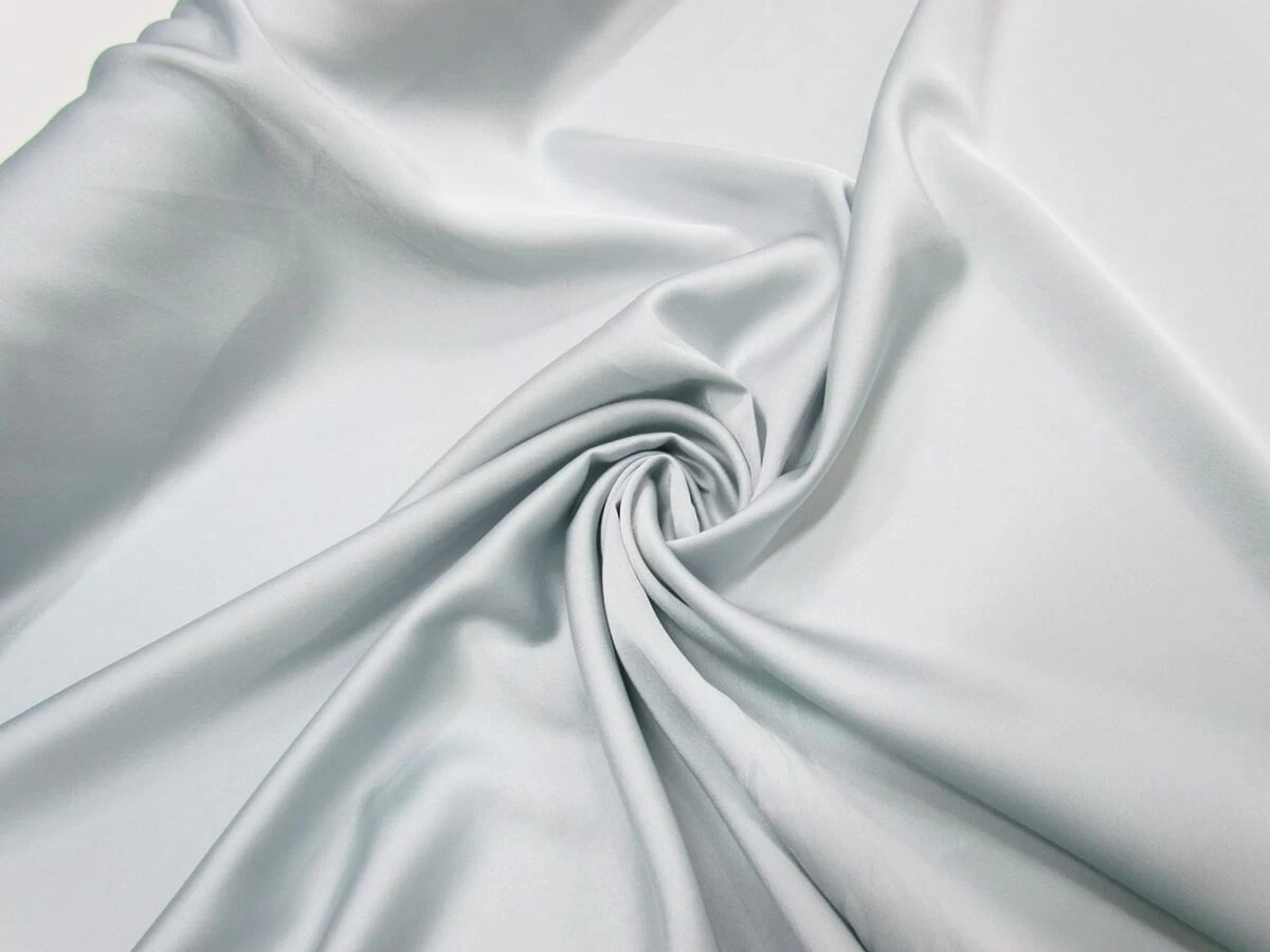 This satin crepe in a soft blue grey colour has a slightly lustrous sheen and is a soft fabric with slight texture from the crepe weave, with the reverse side having a matte and more textured feel. This soft satin crepe is a light weight fabric with a slight stretch along the weft of the fabric. This satin crepe is a mostly opaque fabric, although darker colours may be seen through so a lining may be desired.