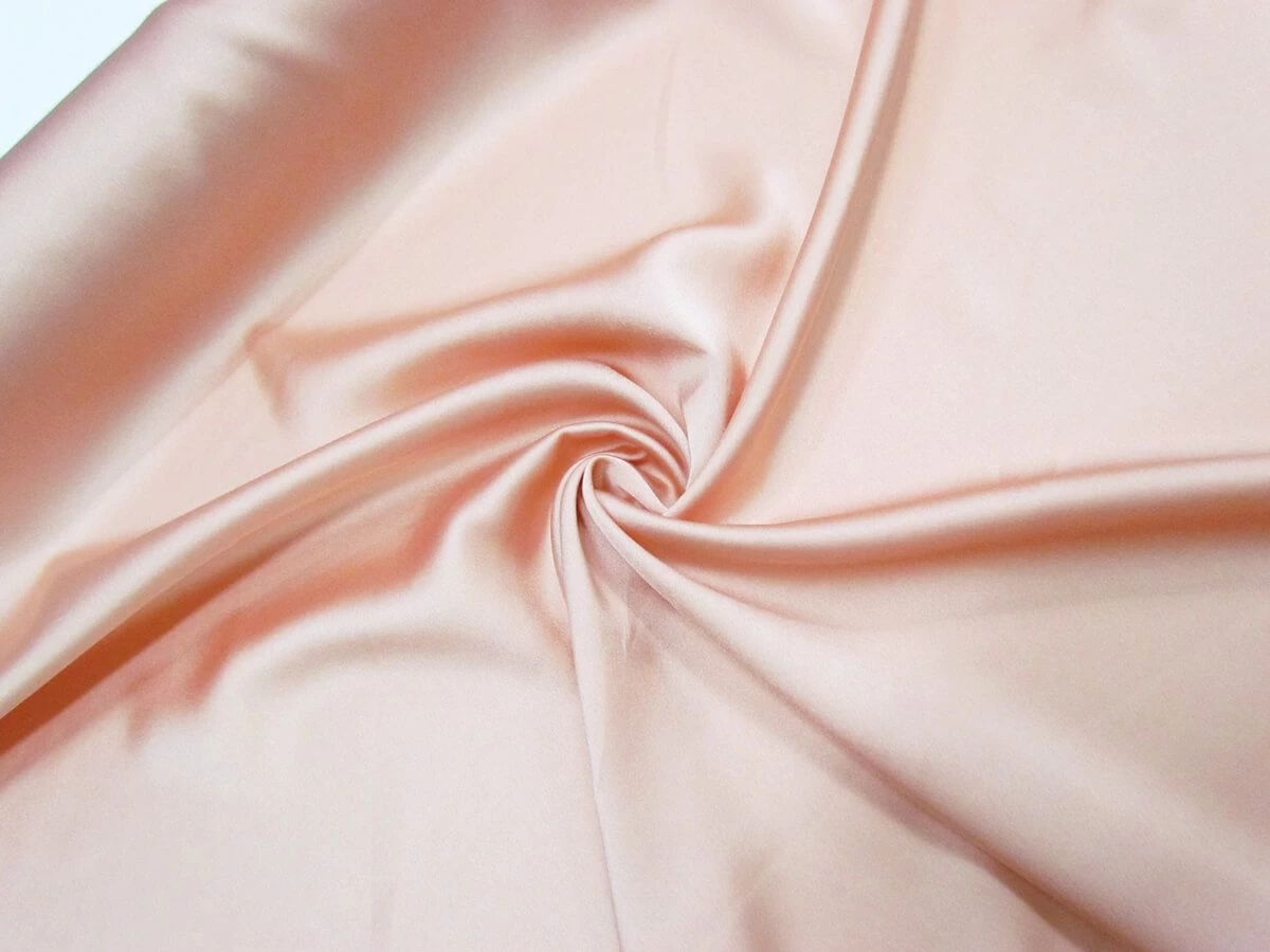This satin crepe in a salmon pink colour has a slightly lustrous sheen and is a soft fabric with slight texture from the crepe weave, with the reverse side having a matte and more textured feel. This soft satin crepe is a light weight fabric with a slight stretch along the weft of the fabric. This satin crepe is a mostly opaque fabric, although darker colours may be seen through so a lining may be desired.