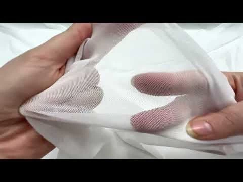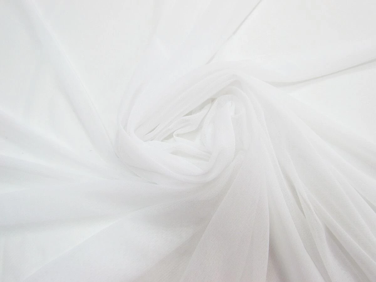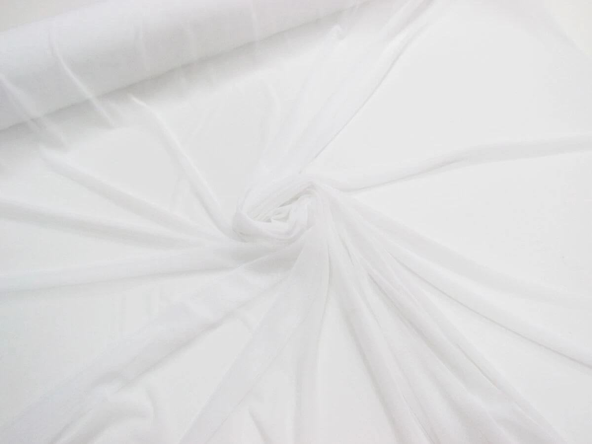 This plain white mesh fabric is very lightweight, with a very soft textured feel. This knit has a good stretch along the weft of the fabric, and no stretch along the warp. This fabric will drape softly. This mesh has a sheer look.
