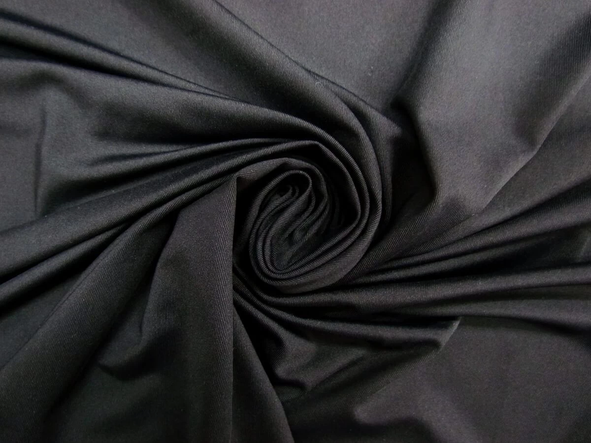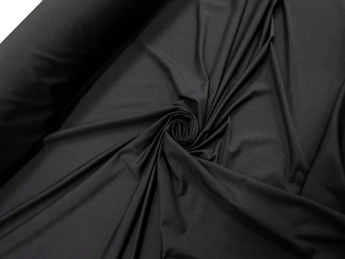 This black fabric is a light weight spandex with great stretch and return along the weft and good stretch and return along the warp too. This spandex is an opaque fabric, that becomes less opaque the further it is stretched. This spandex is perfect to be used as a lining or outer fabric in various projects.