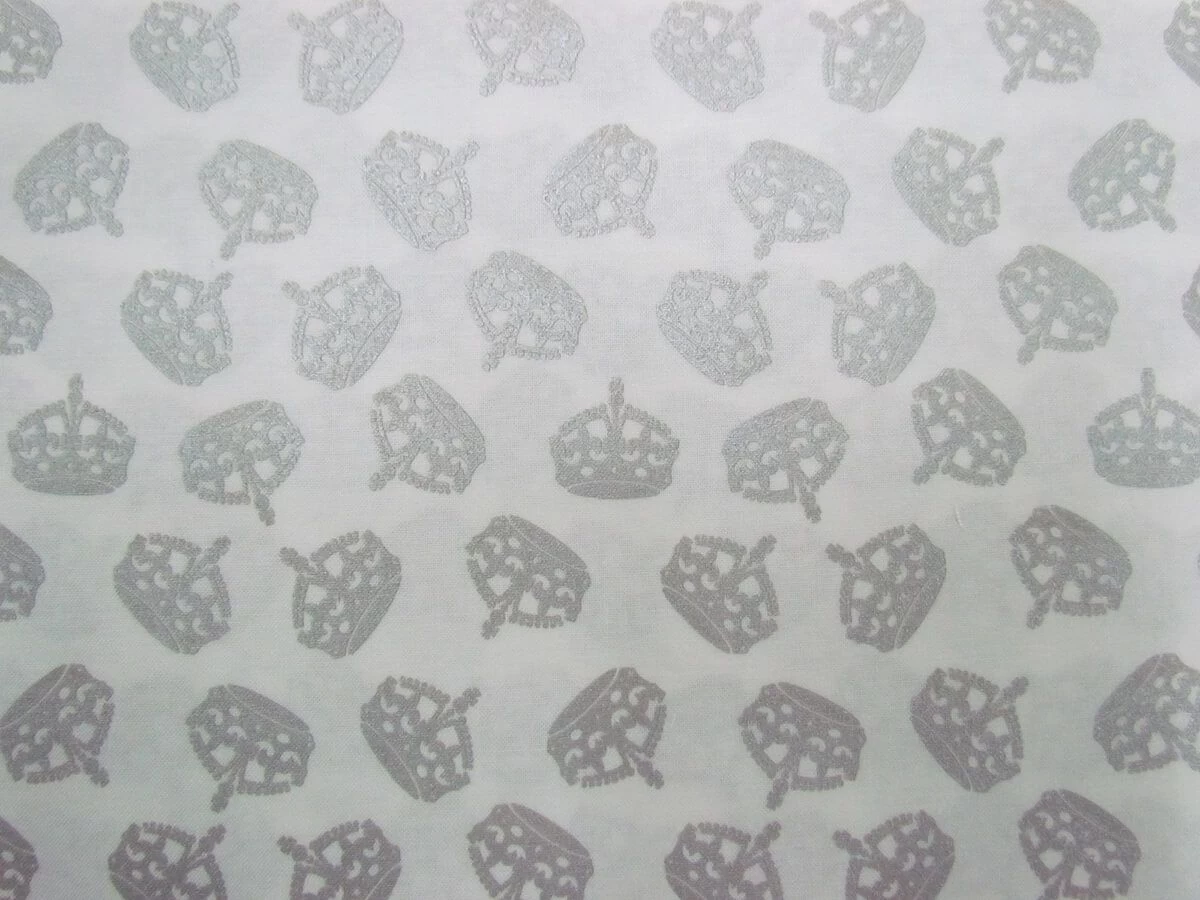 This 100% cotton fabric is soft and smooth. This cotton is suitable for patchwork and quilting projects, as well as shits, tops, dresses and skirts. A cotton voile fabric or lining fabric may be desired for dresses and skirts. This cotton fabric features a crown print of silver foil on a grey background, for a sparkle sheen finish.