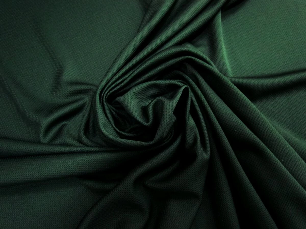 This lightweight knit fabric looks and feels like a sports eyelet mesh jersey fabric. This is a relatively light fabric, with micro holes in the knit structure. There is only some very slight give in this fabric. This green sports knit has a soft and comfortable feel. This jersey is only semi-opaque.