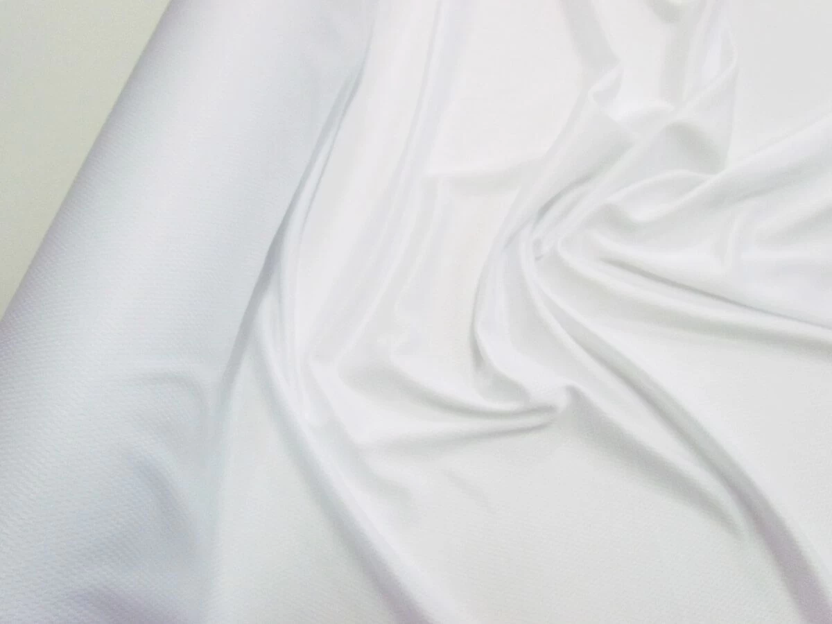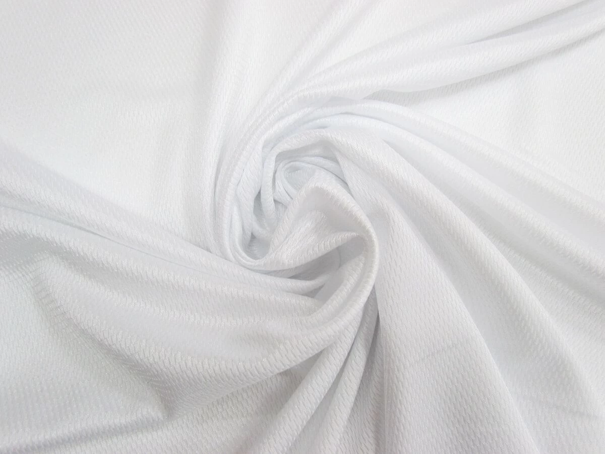 This lightweight knit fabric looks and feels like a traditional sports eyelet mesh jersey fabric. This is a relatively light fabric, with open holes in the knit structure. There is a good stretch and return in one direction, along the weft of this fabric.