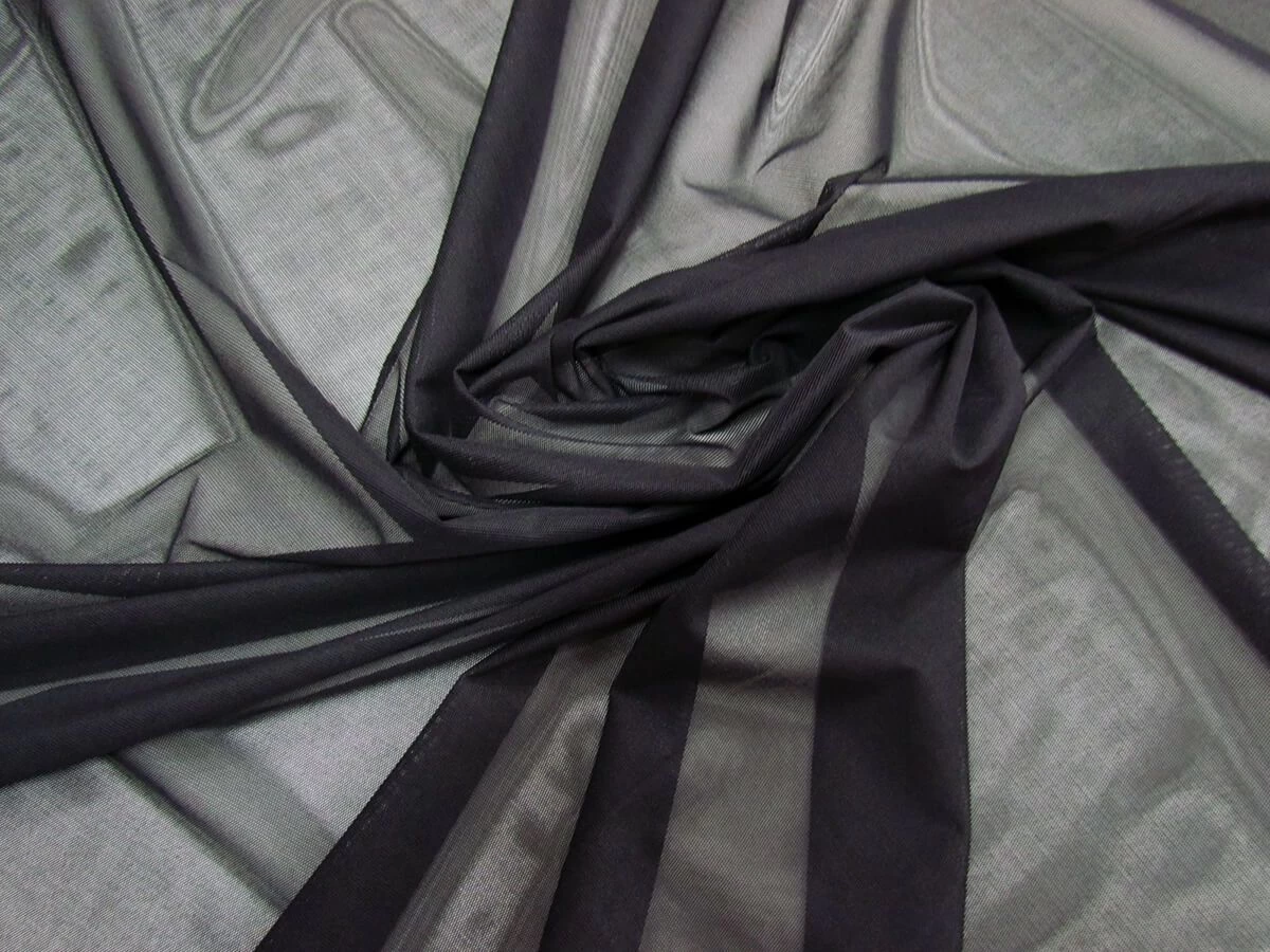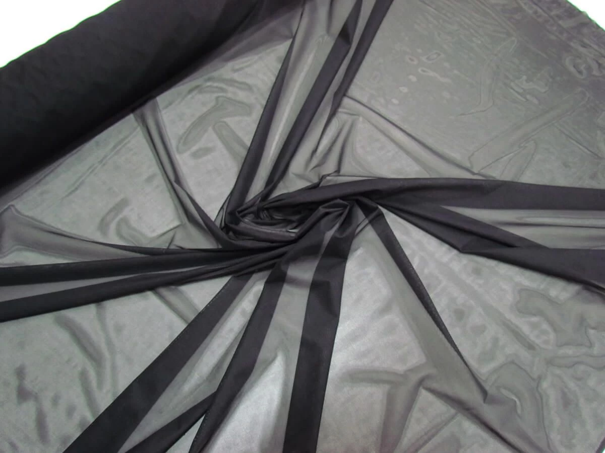 This plain black coloured stretch mesh fabric is lovely and lightweight. This mesh fabric has the best degree of stretch and return along the warp of the fabric, and a bit less stretch along the weft. Suitable for fashion, dance, sport as well as tops, kaftans, wraps, pool side attire and other fashion garments.