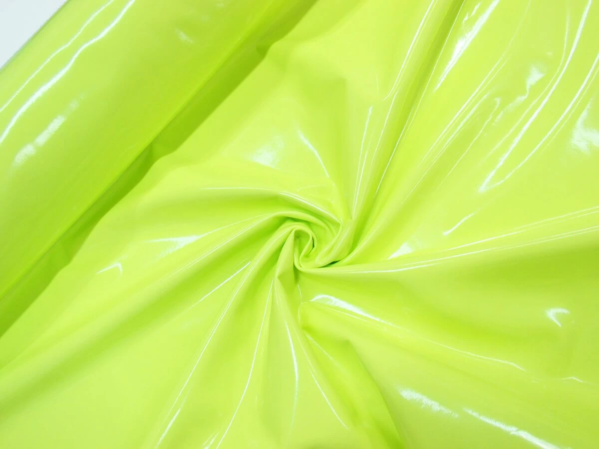 This bright yellow stretch PVC vinyl is a medium weight fabric with a very smooth shiny finish on one side, and a matte reverse side that is soft and comfortable. This PVC has a good degree of two way stretch and return, with slightly more stretch along the weft of the fabric, this PVC does not crack or sheer when stretched to its full capacity. This PVC fabric has a wide selvedge on both sides, with the full width of the fabric measuring approximately 150cm and the shiny yellow side measuring approximately 140cm.