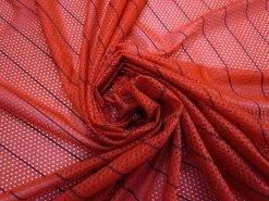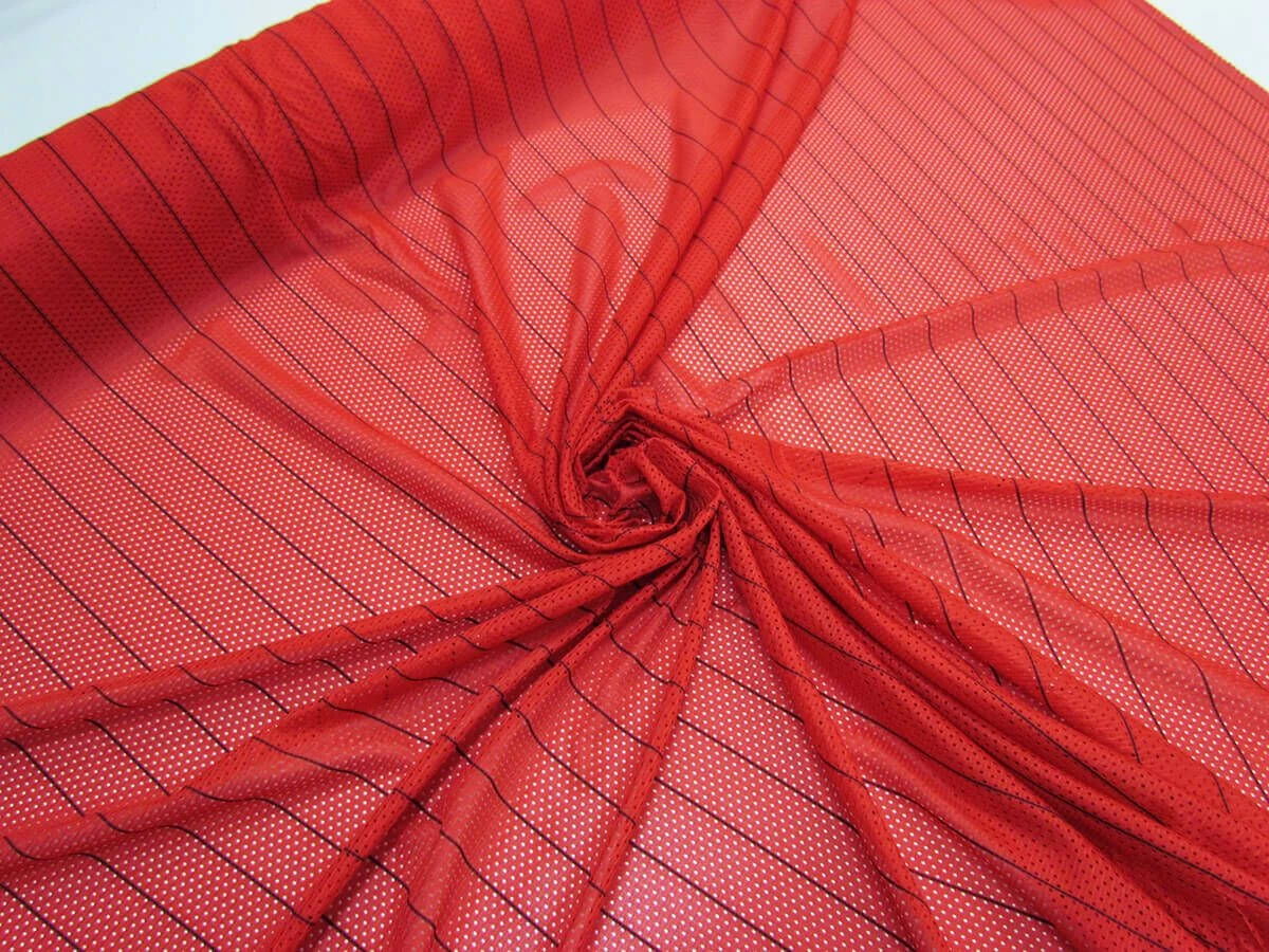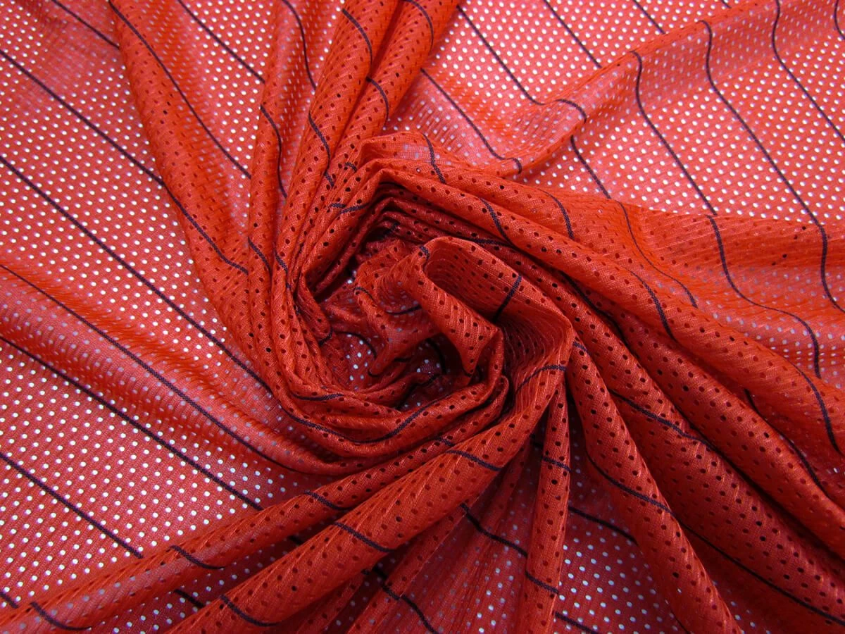 This lightweight polyester mesh fabric looks and feels like a traditional basketball mesh jersey fabric. This basketball mesh has a striped detail running horizontally across the fabric, parallel to the selvedge. This is a sheer and light fabric, with relatively large holes. There is a slight amount of give / stretch along the weft of the fabric. This mesh fabric has a smooth feel. This basketball mesh has a slight sheen finish. This fabric can be pared with a sports jersey fabric, if an opaque look is desired.