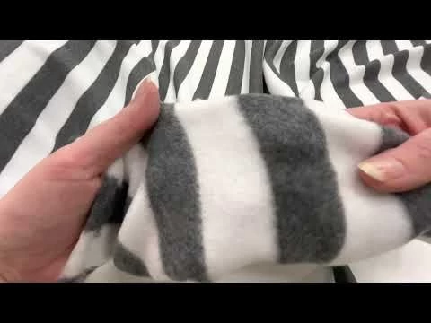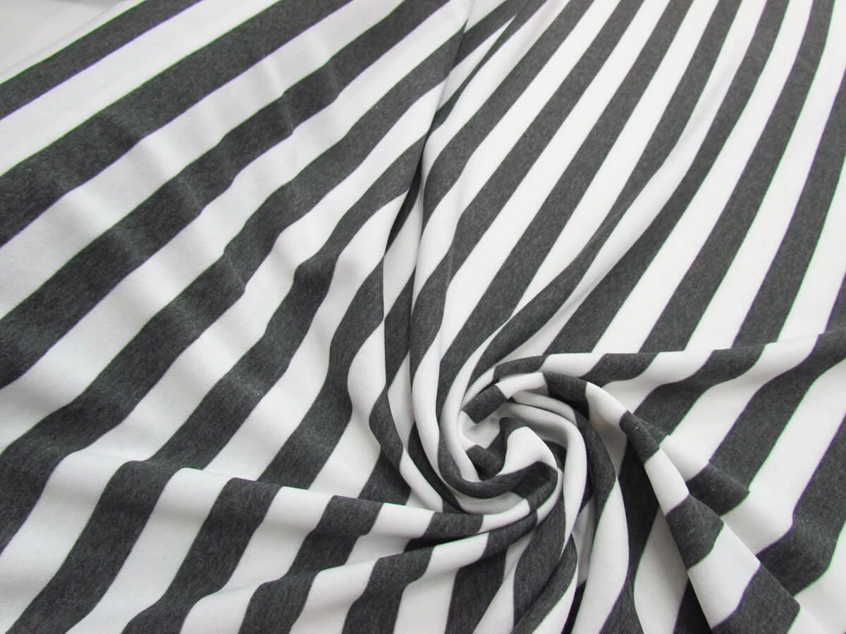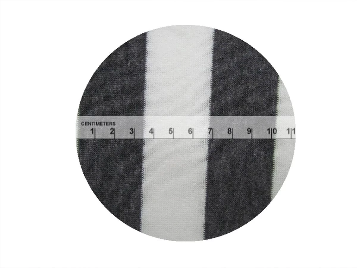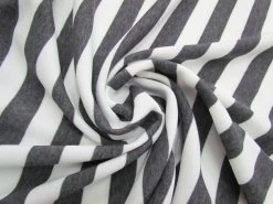 This knit fabric has sweatshirt fleece feel and look. The face of this fleece also has a flat knitted look, and the underside is soft and brushed fluffy. This fleece knit fabric has no real stretch, but some slight give along the weft of the fabric. Suitable for jumpers, hoodies, tracksuits, track pants, and other items of apparel. This fleece is semi-opaque, and does show through a little. The stripes on the fabric are approximately 30mm wide, and run vertically down the fabric.