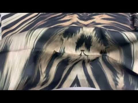 This lightweight satin has an abstract tiger stripe print and is a fabric with a nice soft feel and lovely drape. This lightweight satin is a mostly sheer fabric with a subtle sheen. Due to the sheer nature of the fabric, a lining may be desired for apparel applications for opacity.