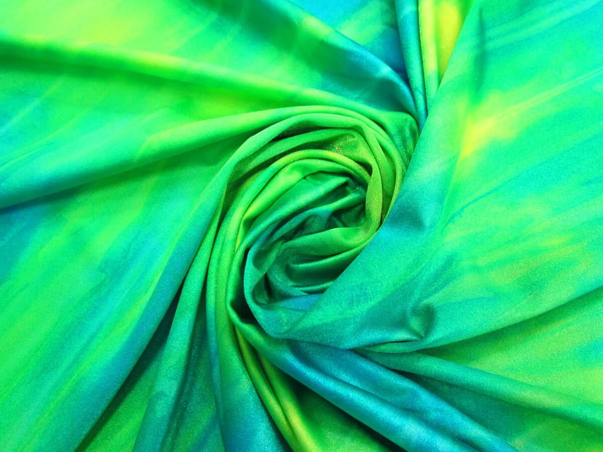 A printed shiny spandex, this fabric is slinky and soft, and has great stretch and movement in all directions. This spandex has a shiny finish sheen that catches the light in a wonderful way. Though relatively lightweight, this shiny spandex is good for dance wear, costumes, and active wear. As this is such a stretchy spandex, this semi-opaque fabric does become less opaque when stretched, so a lining fabric may be required for some uses. This spandex has a tie dye look, and the tie dye is printed in stripes, running parallel to the selvedge.