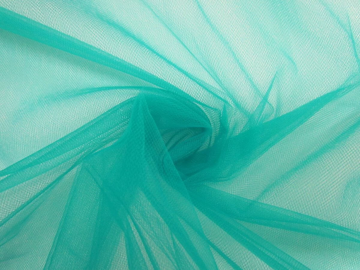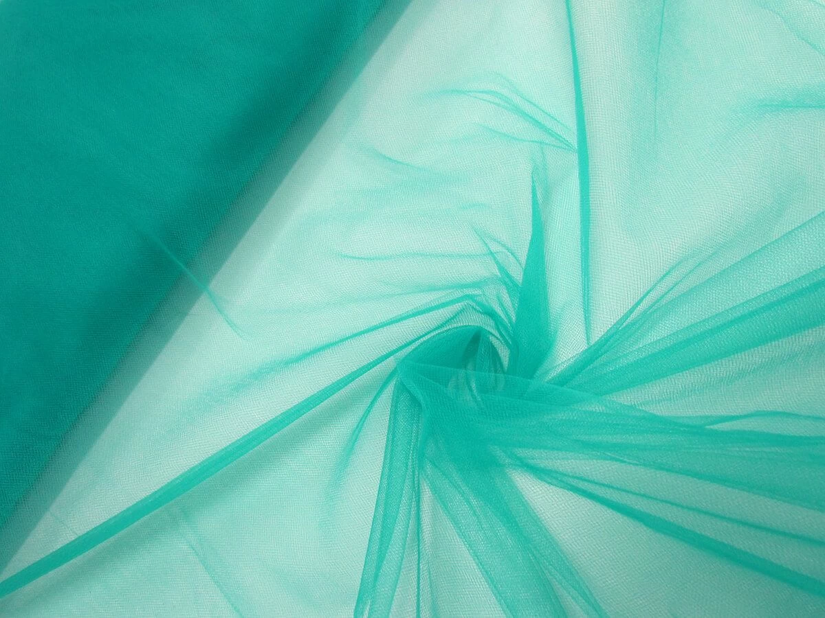 This wide width teal tulle is a soft and very light weight net fabric that is very sheer, with one layer being barely visible with a subtle colour. However, when this tulle is layered or gathered it has a more opaque look and more concentrated colour. This tulle has a light degree of stretch along the weft, however it does not have great return and may warp when stretched. This tulle is ideal for use in various apparel, costuming and eveningwear applications.