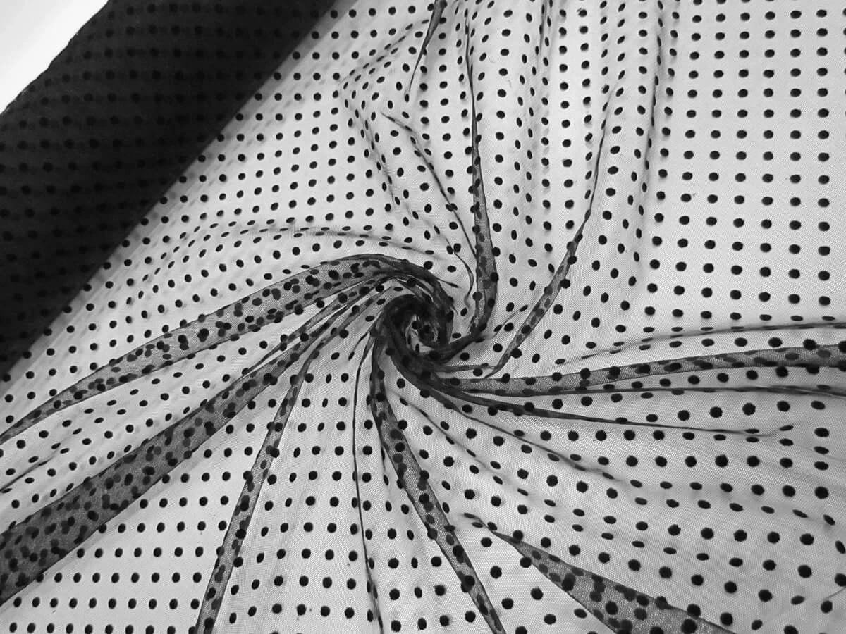 This black net is a very lightweight fabric that has a very sheer look. This net has flocked velvet spots measuring approximately 5mm in diamater that are opaque and have a soft feel to them. This fllocked net has some slight stretch along the warp and weft, however does not have great return. Gather, layer or line this tulle for a more opacity or leave as is for a more subtle, sheer and delicate look.