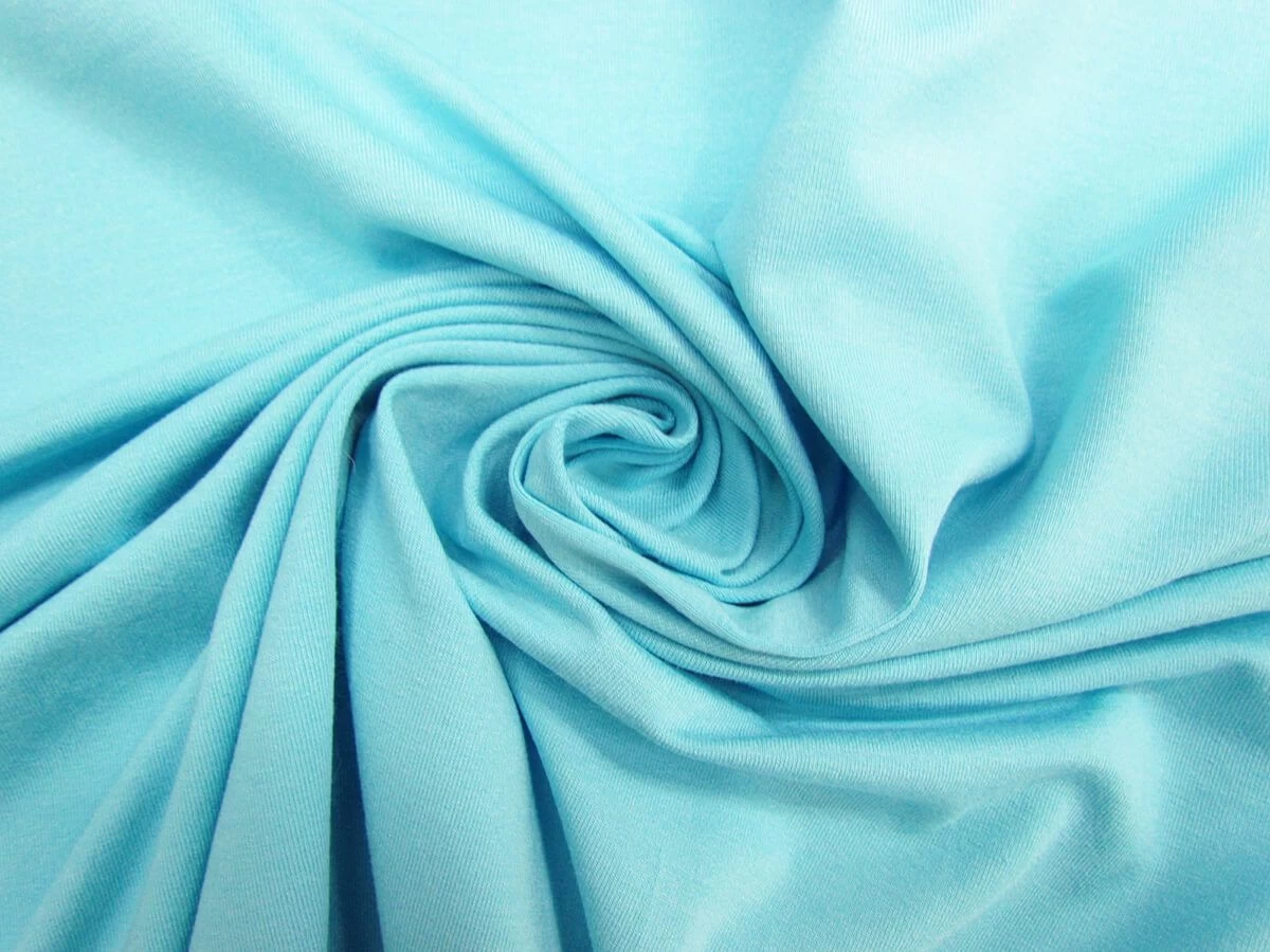 This light blue viscose jersey is a medium weight jersey with great drape and a soft feel and look. This lovely jersey has excellent stretch and return along the weft of the fabric, with great stretch and return along the warp too. This jersey is an opaque fabric, although may sheer more when stretched, so a lining may be desired for some purposes.