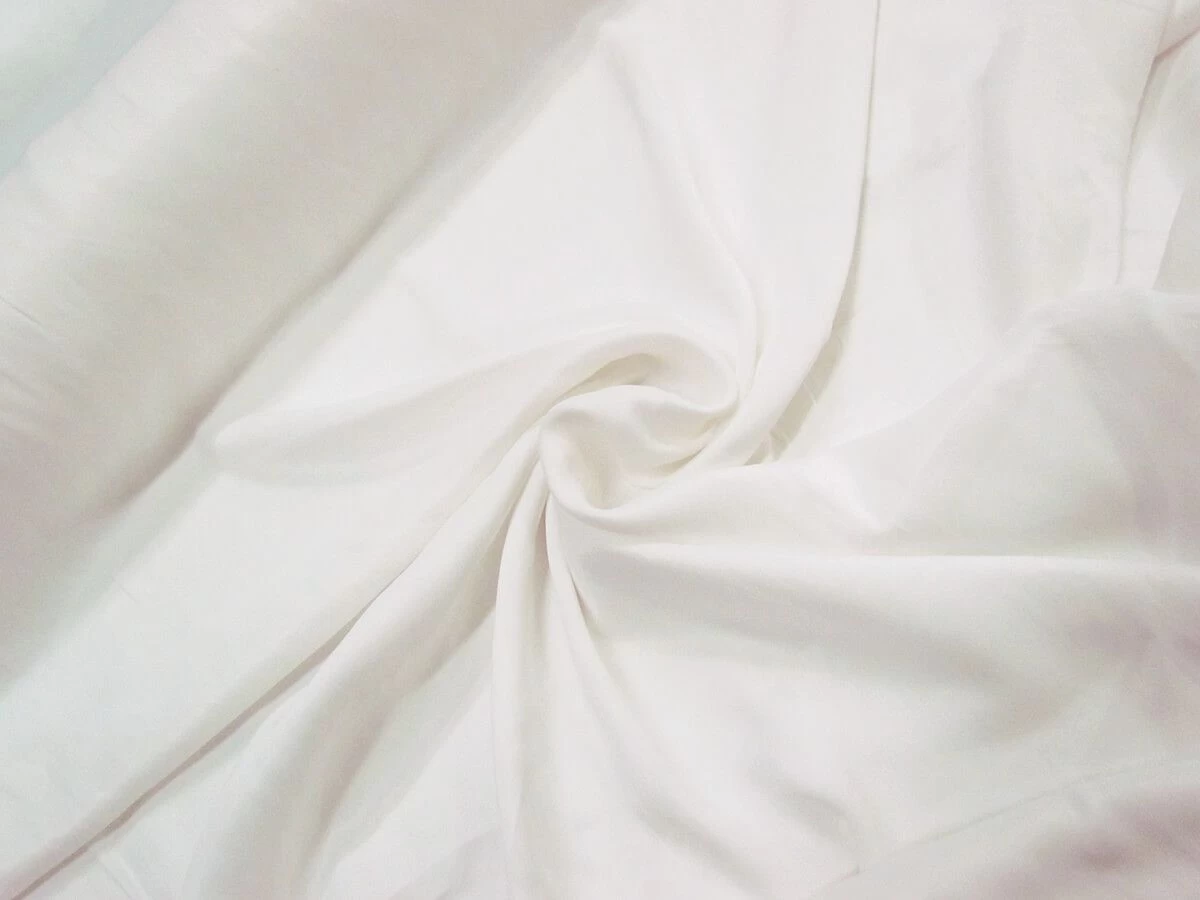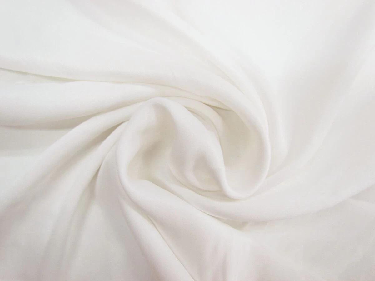 This bright white satin back crepe is a light weight fabric that has a crepe textured, matte face with a more lustrous and smooth reverse side. This drapey satin back crepe is made from viscose and is a semi-opaque fabric, that may require a lining if opacity is desired.