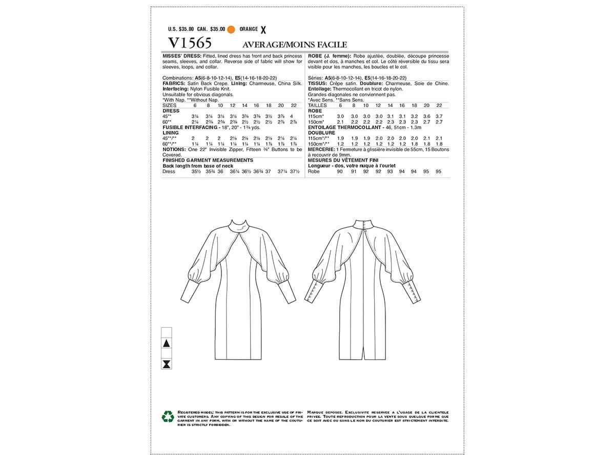 Vogue Pattern V1565 Misses’ High Neck Dress with Full Sleeves- Size 14-16-18-20-22 – is a standard printed tissue pattern (not downloadable). Fitted lined dress has front and back princess seams, sleeves and collar. Reverse side of fabric will show for sleeves, loops and collar. See the second image for back of the pattern packet which lists recommended fabric types, notions and meterage required. Click here for Vogue Patterns size charts