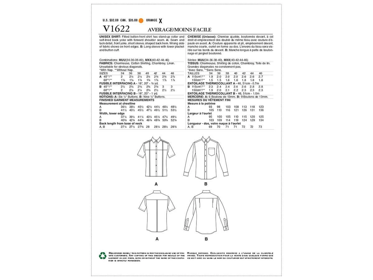 Vogue Pattern V1622 Unisex Shirt- Size 40-42-44-46 – is a standard printed tissue pattern (not downloadable). Fitted button-front shirt has collar with stand and self-lined back yoke with forward shoulder seam. A: Seam and tuck detail, front yoke, short sleeve, shaped back hem. B: Long sleeve with tower placket and button cuff. A: Wrong side of fabric shows on front edges. See the second image for back of the pattern packet which lists recommended fabric types, notions and meterage required. Click here for Vogue Patterns size charts