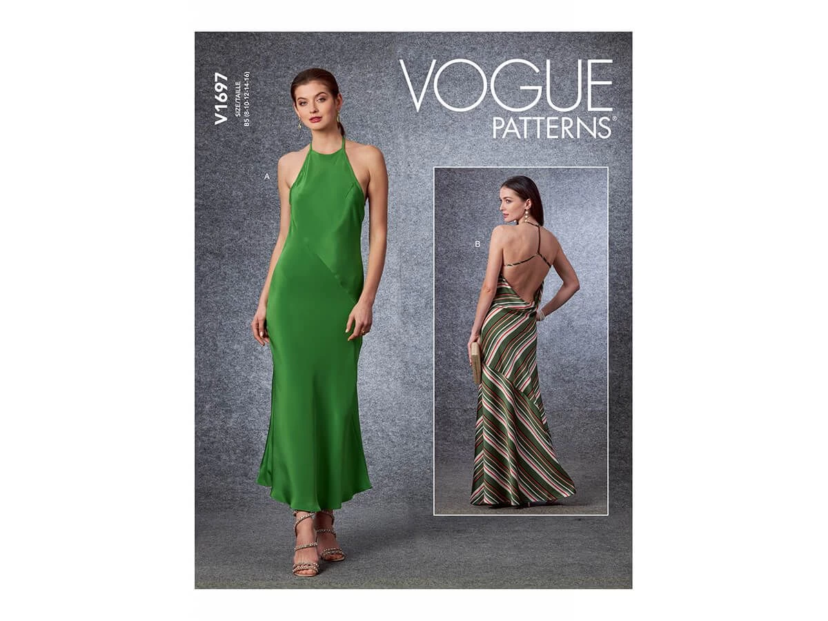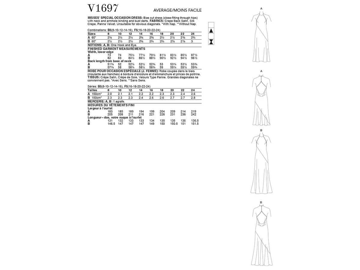 Vogue Pattern V1697 Misses’ Special Occasion Dress- Size 16-18-20-22-24 – is a standard printed tissue pattern (not downloadable). Bias cut dress (close-fitting through hips) with neck and armhole binding and bust darts. See the second image for back of the pattern packet which lists recommended fabric types, notions and meterage required. Click here for Vogue Patterns size charts