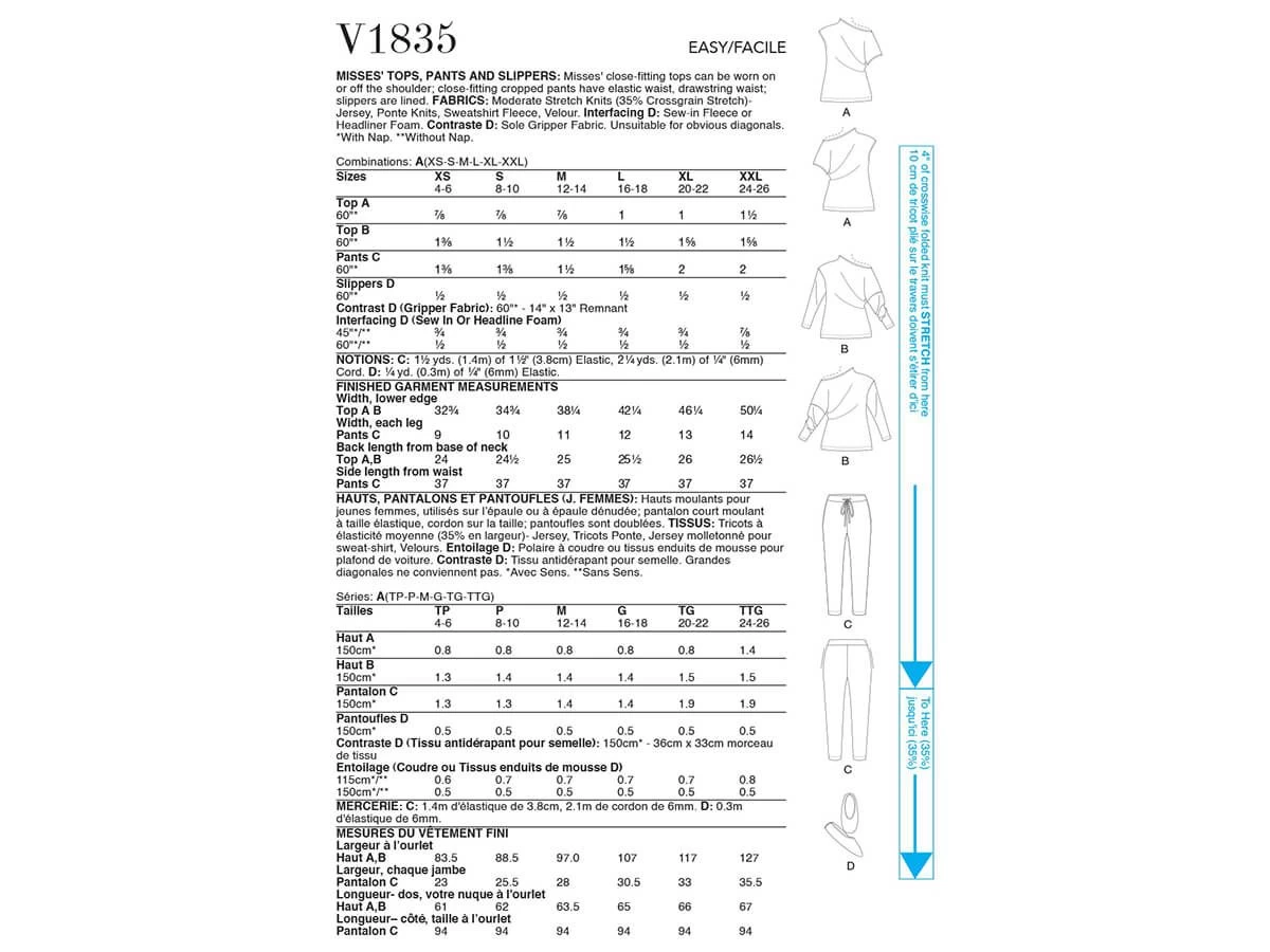 Vogue Pattern V1835 Misses’ Tops, Pants and Slippers- Size A (XS-S-M-L-XL-XXL) – is a standard printed tissue pattern (not downloadable). Misses’ close-fitting tops can be worn on or off the shoulder; close-fitting cropped pants have elastic waist, drawstring waist. Slippers are lined. See the second image for back of the pattern packet which lists recommended fabric types, notions and meterage required. Click here for Vogue Patterns size charts