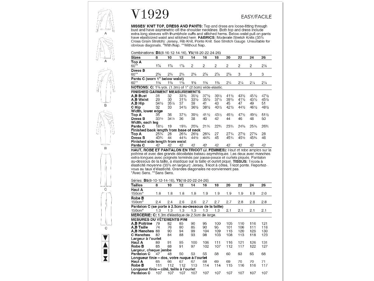 Vogue Pattern V1929 Misses’ Knit Top, Dress and Pants- Size 18-20-22-24-26 – is a standard printed tissue pattern (not downloadable). Top and dress are loose-fitting through bust and have asymmetric off-the-shoulder necklines. Both top and dress include extra-long sleeves with thumbhole cuffs and stitched hems. Below-waist pull-on pants have elasticized waist and stitched hem. See the second image for back of the pattern packet which lists recommended fabric types, notions and meterage required. Click here for Vogue Patterns size charts