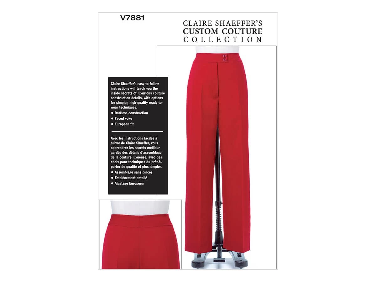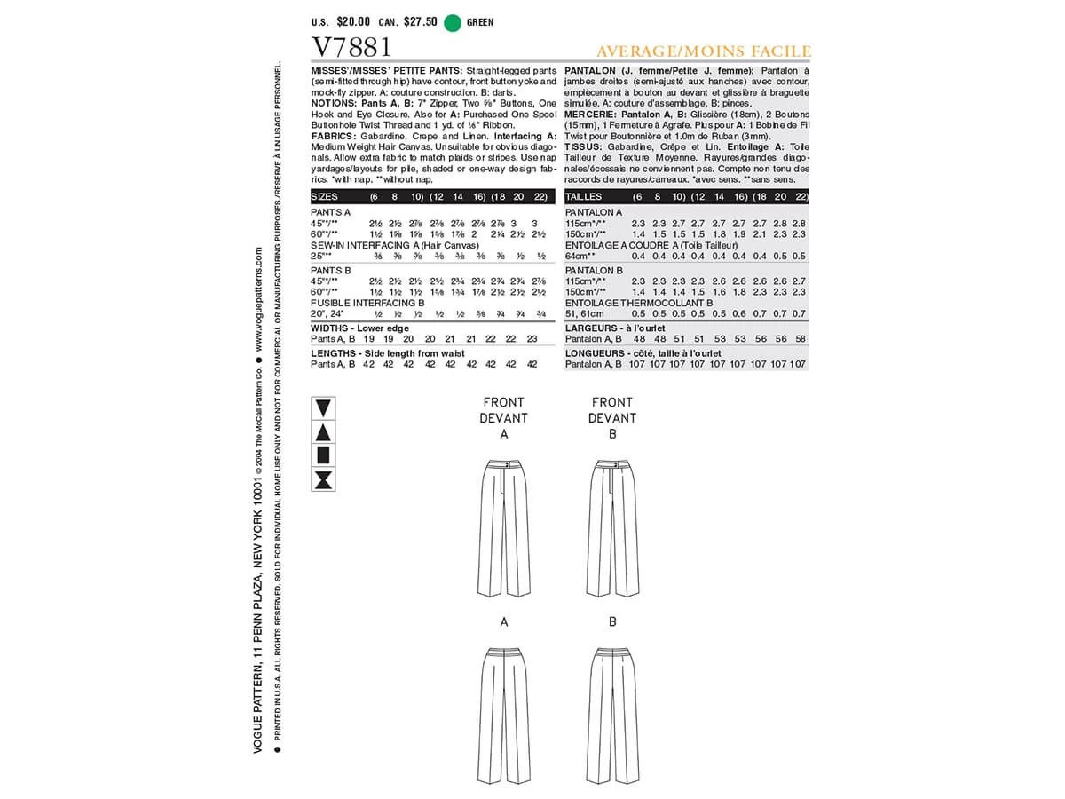 Vogue Pattern V7881 Misses’/Misses’ Petite Pants- Size 6-8-10 – is a standard printed tissue pattern (not downloadable). Straight-legged pants (semi-fitted through hip) have contour, front button yoke and mock-fly zipper. A: couture construction. B: darts. See the second image for back of the pattern packet which lists recommended fabric types, notions and meterage required. Click here for Vogue Patterns size charts