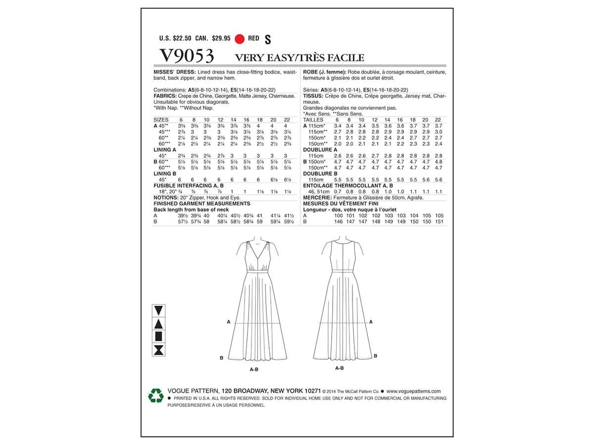 Vogue Pattern V9053 Misses’ Dress- Size 14-16-18-20-22 – is a standard printed tissue pattern (not downloadable). Lined dress has close-fitting bodice, waistband and back zipper. Narrow hem. See the second image for back of the pattern packet which lists recommended fabric types, notions and meterage required. Click here for Vogue Patterns size charts