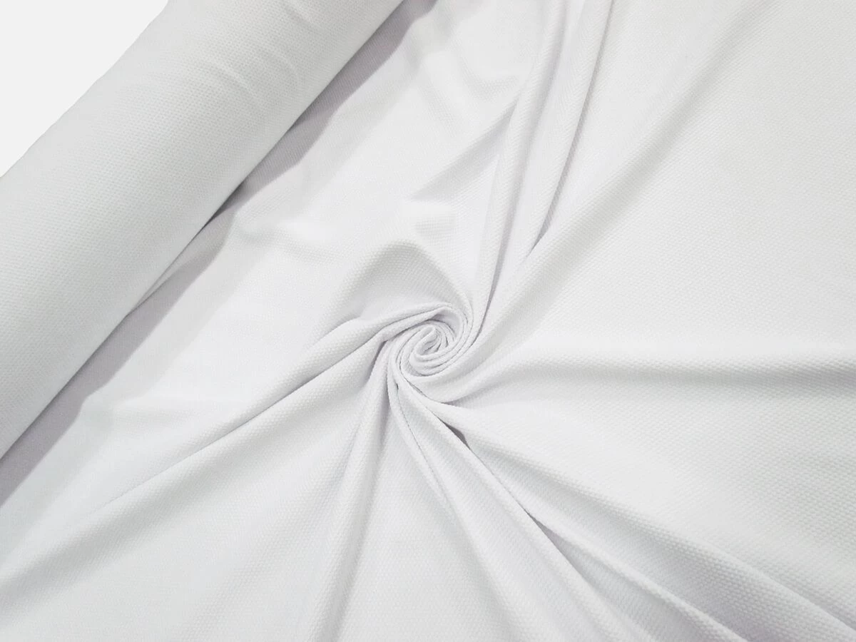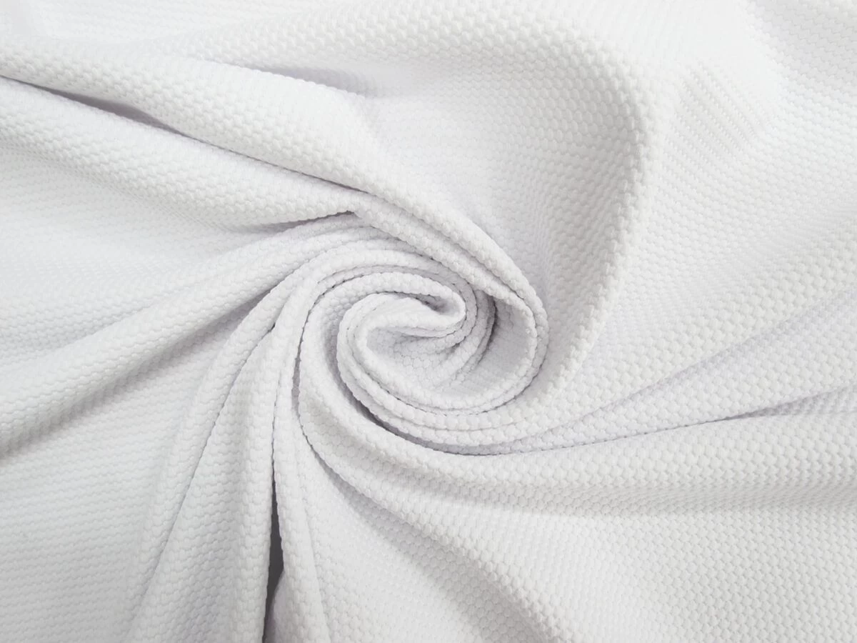 This waffle knit fabric has a unique waffle texture and is a medium weight fabric. This waffle knit has good two way stretch and is mostly opaque, and becomes less opaque the furhter it is stretched,so a lining may be desired in some applications.
