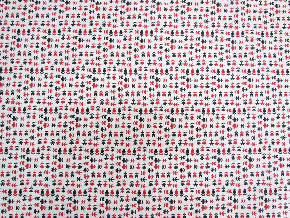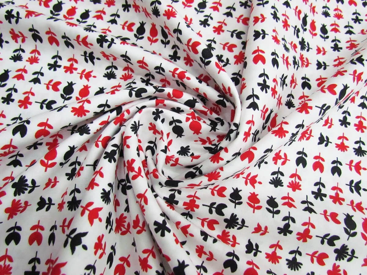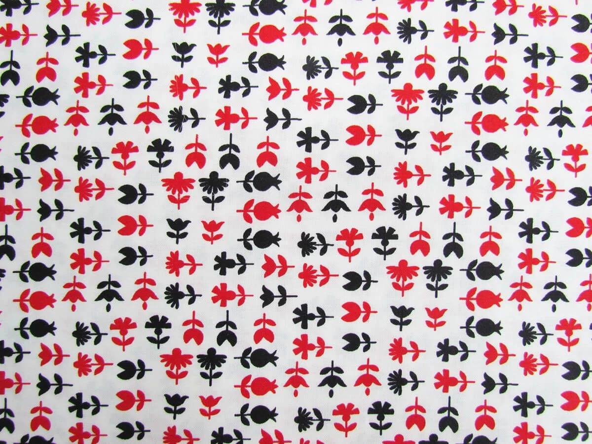 This 100% cotton fabric is soft, with a smooth finish. Suitable for patchwork and quilting projects as well as shirts, tops, dresses and skirts. Cotton voile or lining fabric may be desired for dresses and skirts. This cotton features a print of small black and red florals on a white background.