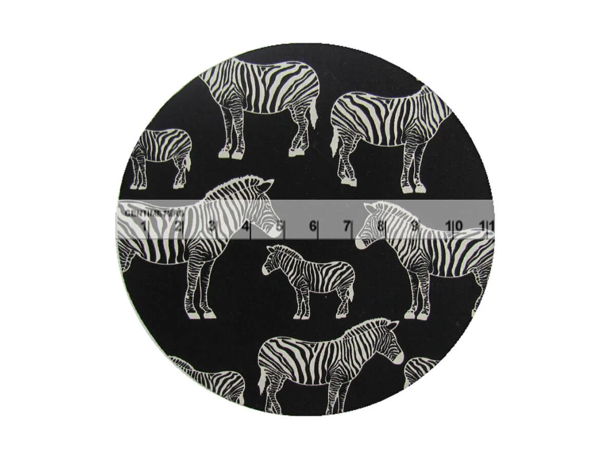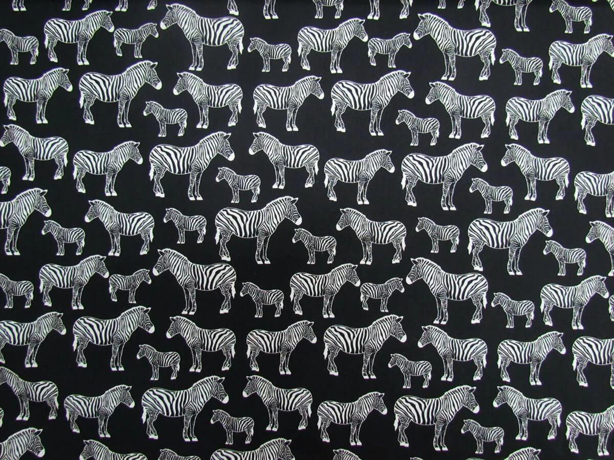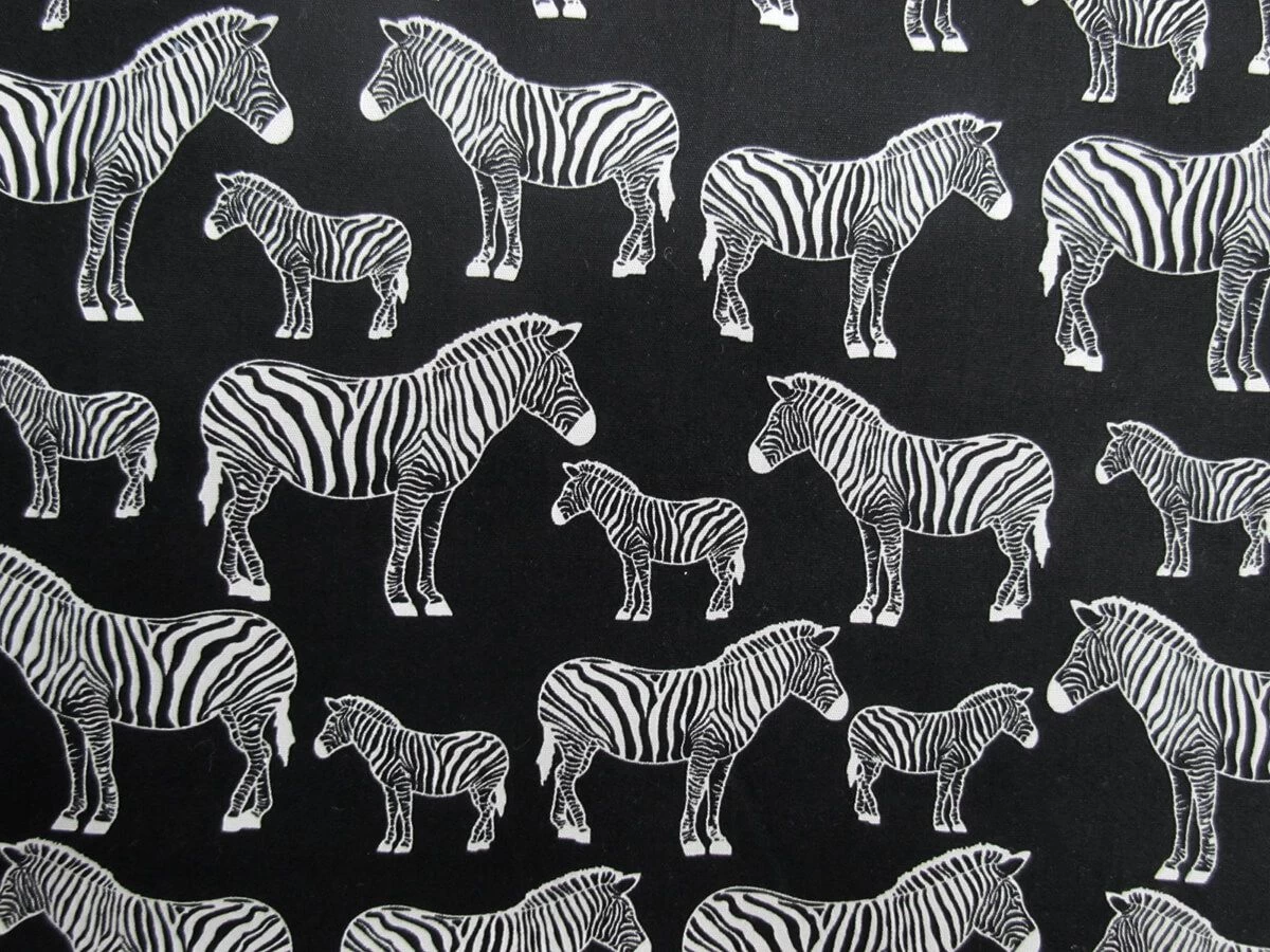 This is a lightweight 100% cotton fabric suitable for patchwork projects that features a zebra print on a black background. This cotton is also suitable for other clothing and craft projects, although may need a lining in apparel applications.